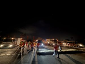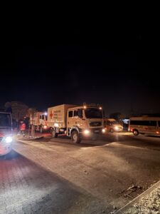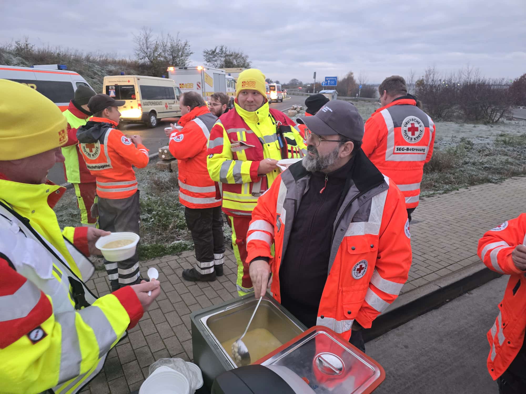 210 km Fahrstrecke in Dunkelheit und zuckendem Blaulicht waren zu bewältigen. Zwei technische Halte waren auf der Strecke eingeplant. Beim zweiten Halt wurde die Zeit bei einer heißen Nudelsuppe und Kaffee bzw. Tee verbracht. Was bei den derzeitigen Temperaturen sehr gut ankam.