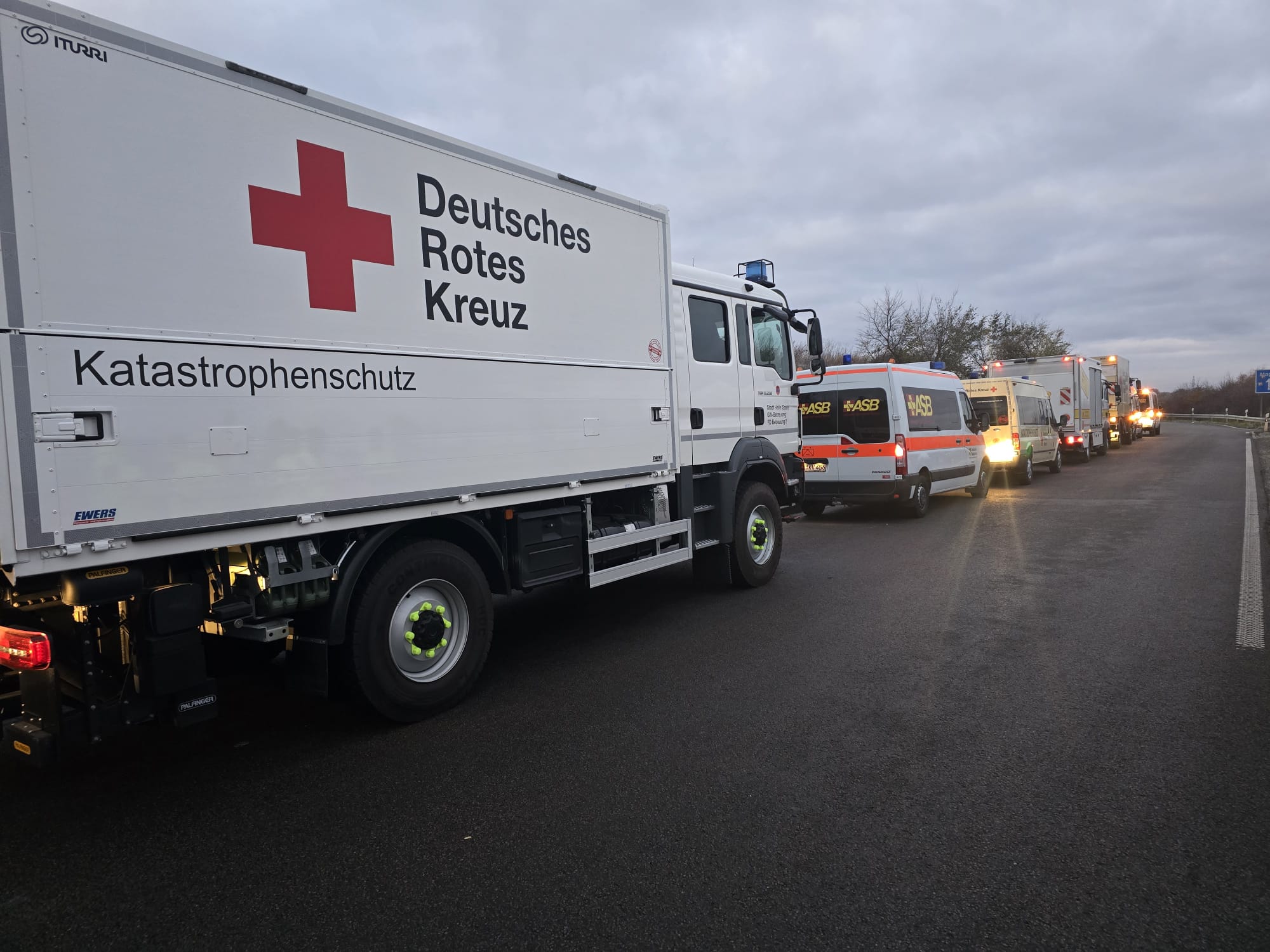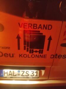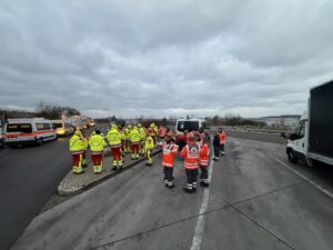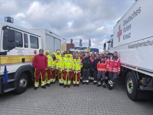 Nach erfolgter Alarmierung und Herstellung der Marschbereitschaft ging es in den vorher festgelegten Bereitstellungsraum. Dort trafen wir uns mit dem Fachdienst Sanität 1 des ASB zu einer Ausbildungsfahrt (Marschverband/ Verlegung von Einsatzkräften) mit 14 Fahrzeugen und 34 Helfern.